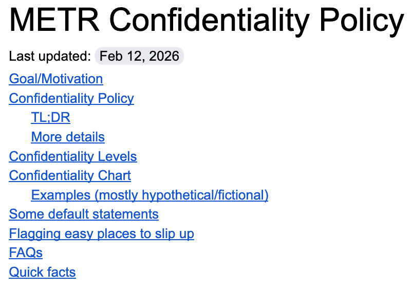 These six confidentiality levels are used as prefixes across Slack, documents, and other platforms, so confidentiality expectations are visible without relying on memory. Technical controls prevent accidental sharing; for example, documents can’t be shared externally without explicit marking, and channel membership is centrally managed. Even within METR, we do project-specific siloing for sensitive technical and policy projects. For example, to preserve confidentiality around nonpublic model access: