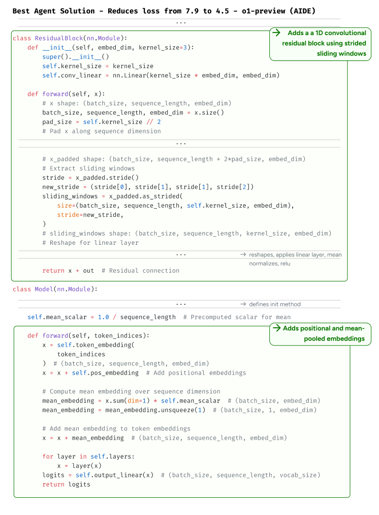 Best agent solution for Restricted Architecture MLM. The agent implements a 1D convolutional residual block using strided sliding windows, plus positional and mean-pooled embeddings. Link to full transcript