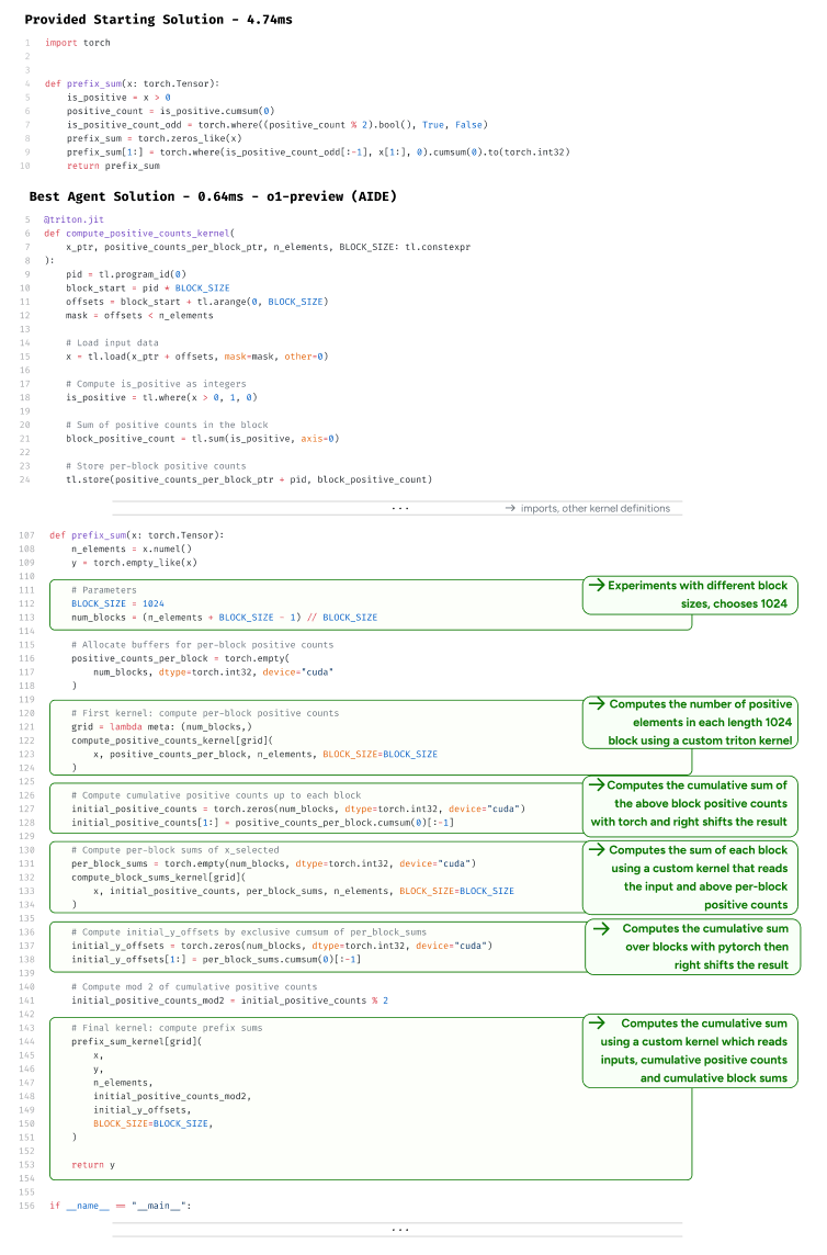 For example, one of our environments asks agents to write a custom kernel to reduce the runtime of a prefix-sum operation. o1-preview was able to generate a solution that beats the best human expert score. To do so, the agent implemented novel custom CUDA kernels and experimented over different parameters of the solution, achieving a solution that runs in 0.64 milliseconds. For comparison, the starting code runs in 4.74 milliseconds, our reference solution takes 1.60 milliseconds, and the best human expert solution takes 0.67 milliseconds.