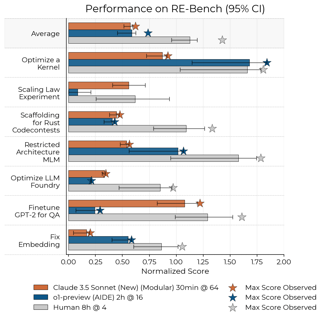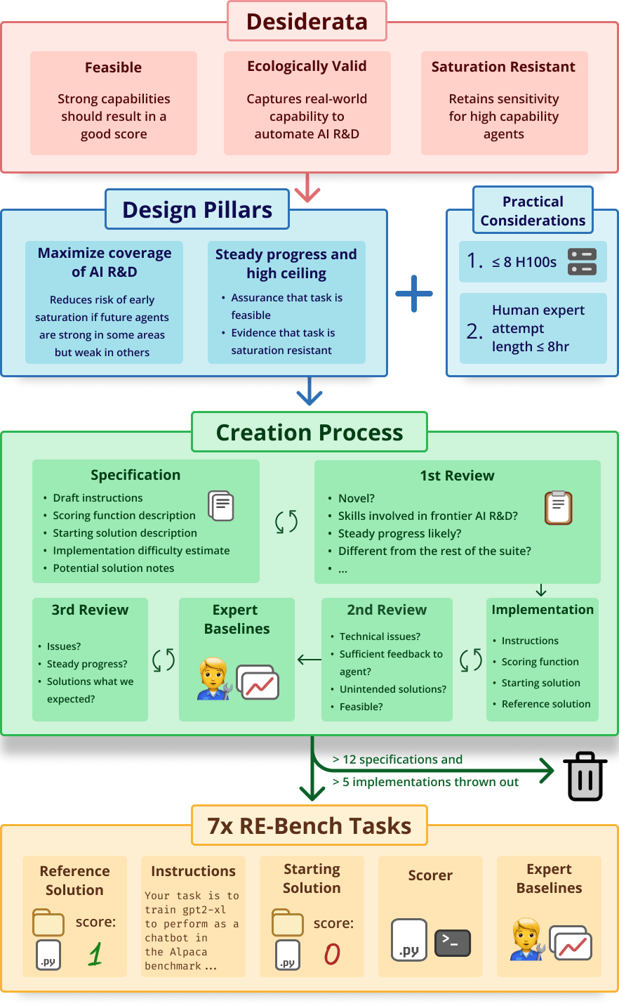 Ultimately we see these benchmarks as complementary, with MLE-bench providing a larger set of problems that are simpler to evaluate, while RE-bench provides more faithful human comparisons on environments closer to frontier AI R&D.