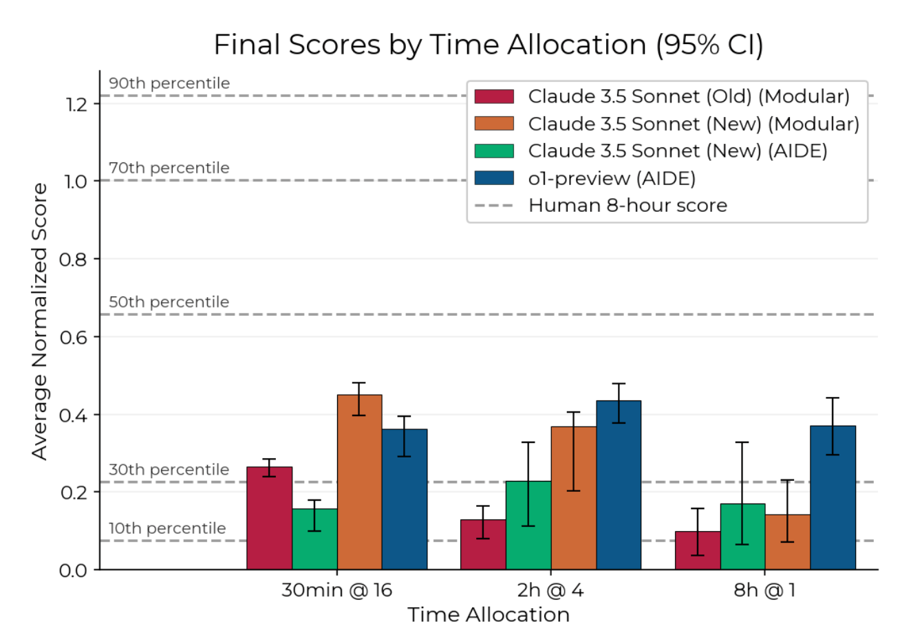 In real ML research, access to large datacenters doing large amounts of computation is often a limiting factor. Similarly, in our environments it is much easier to get a high score if you can run lots of computation-intensive experiments. To account for this, we assess performance relative to a given “total computer time” budget. Agents can use this budget in different ways: an 8-hour budget could be used for a single 8-hour attempt, or could be split into 16 attempts of 30 minutes each.