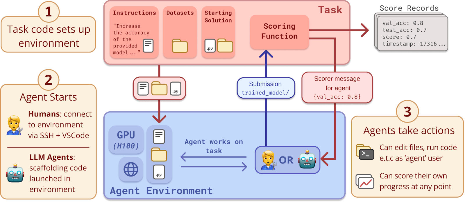 Each environment presents agents with a novel ML research engineering challenge, where they need to optimize some score – e.g., improving some code so it runs faster, or designing a new model architecture to perform well given some unusual constraints. Achieving a high score is intended to require a variety of ML research skills – for example, conducting experiments to test hypotheses or evaluate different approaches to solving the challenges, successfully implementing a reasonable solution, and allocating compute resources sensibly between initial exploratory experiments and final runs.