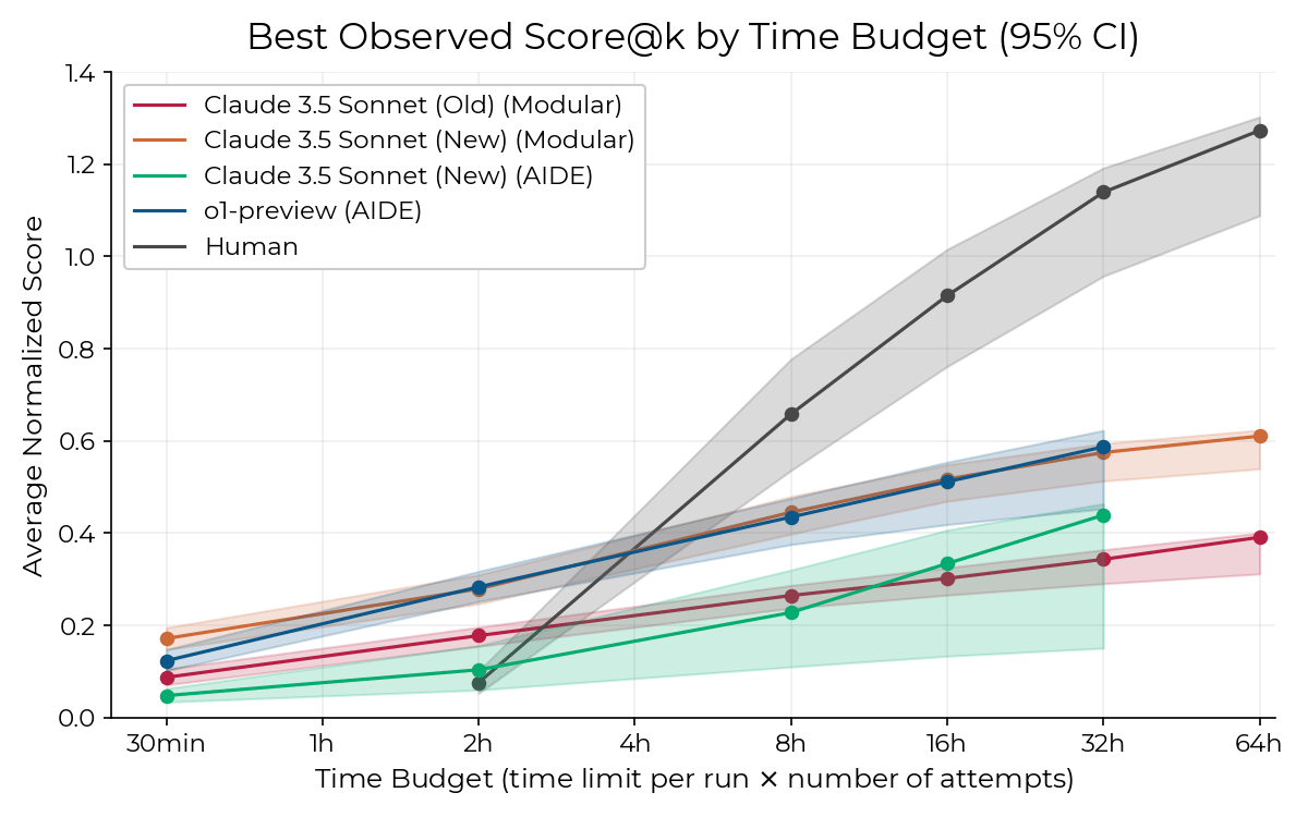 When both have short total time budgets (e.g. 2 hours), AI agents that use frontier models Claude-3.5-Sonnet (new) and o1-preview score higher than our human experts on average. However, as we consider longer time budgets, human scores improve at a faster rate than AI agents’. At a 32-hour time budget, the average human score is almost twice that of the best AI agent.