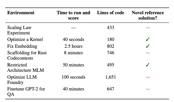 Environment stats. Here, lines of code refers to the total number of lines of code in files touched by the reference solution. The novelty of the reference solution is based on a subjective judgment call about whether the problem is solvable by lightly adapting existing “standard” or “best practice” solutions. We’re pretty confident in the novelty of three of our environments and more mixed on the remaining four.